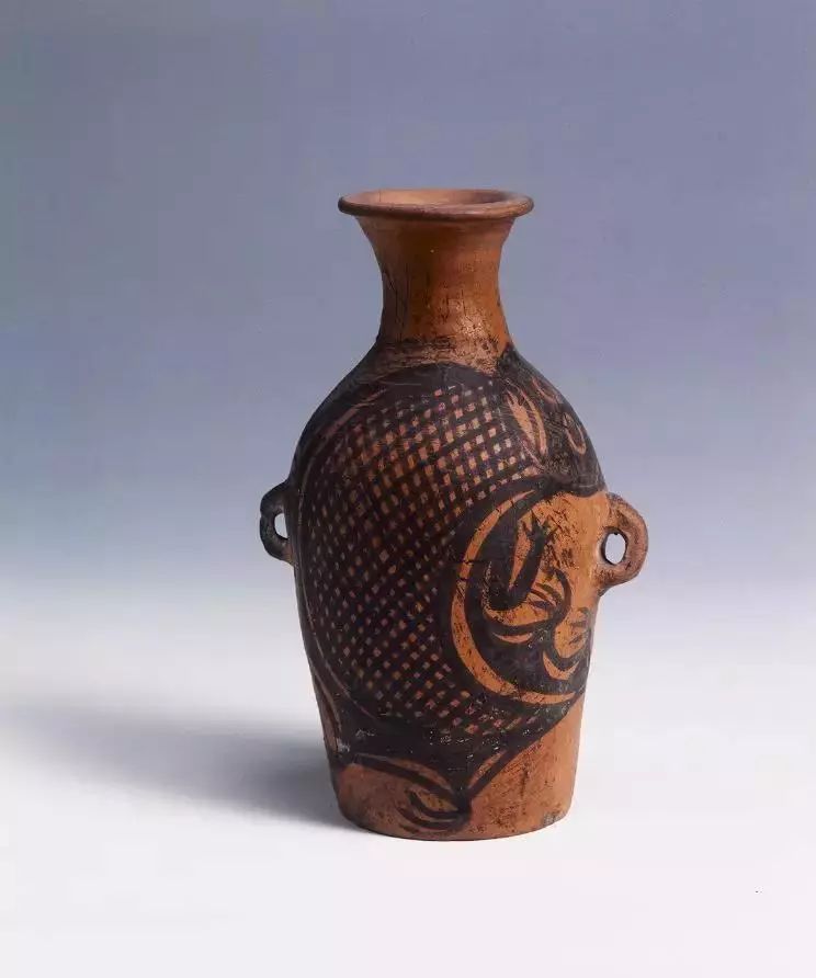 鯢魚紋彩陶瓶,仰韶文化石嶺下類型,出土于武山縣馬力鎮(zhèn)傅家門村種谷臺遺址。國家一級甲等文物,通高18.7厘米。細(xì)泥紅陶,侈口、圓唇、束頸、溜肩、深斜腹、平底,兩側(cè)肩下各有一耳。紅陶黑彩,繪有一條胖大黑色鯢魚,鯢魚紋臉部為人面,有四足,足端各有四爪,尾部上翹,身上繪有網(wǎng)格狀鱗片,紋飾線條流利而靈動,變化豐富。這件彩陶瓶具有非常高的歷史和文化價值,其圖案具有原始龍的雛形,被學(xué)界認(rèn)為是中華龍的起源之一。