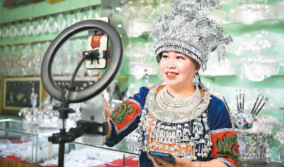 在古州鎮(zhèn)老街,銀飾店店主在進(jìn)行網(wǎng)絡(luò)直播銷售銀飾。