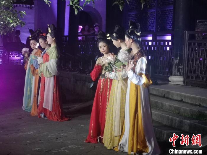 中新網(wǎng)杭州6月9日電(童笑雨)實(shí)景園林中還原杜麗娘游園驚夢(mèng)場(chǎng)景,羅漢堂前身著傳統(tǒng)服飾的年輕人坐在蒲團(tuán)上行飛花令,曼妙身姿在假山上演繹《采薇》獨(dú)舞……這是專屬于浙江省博物館的“奇妙夜”。