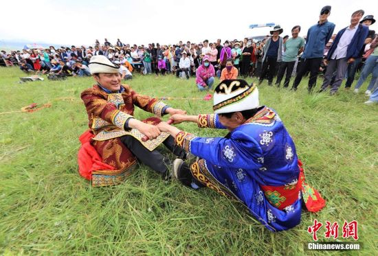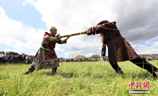 8月8日,甘肅張掖市肅南裕固族自治縣皇城鎮(zhèn)第十六屆民族文化旅游藝術(shù)節(jié)暨傳統(tǒng)體育運(yùn)動(dòng)會拉開帷幕。賽馬、押加、拔棍、頂杠子、射箭、背垛子等一項(xiàng)項(xiàng)少數(shù)民族傳統(tǒng)體育運(yùn)動(dòng)項(xiàng)目,吸引上萬觀眾觀看。近年來,肅南縣將體育項(xiàng)目與歷史、民族、文化、旅游有機(jī)結(jié)合,打造民族體育節(jié)慶品牌和運(yùn)動(dòng)會,使民族傳統(tǒng)體育發(fā)展增加了新的內(nèi)涵,逐步形成了全民健身品牌,影響力不斷擴(kuò)大。圖為參賽選手進(jìn)行拔棍項(xiàng)目比賽。 趙琳 攝