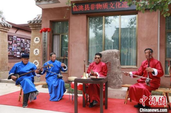 10月12日,甘肅省定西市臨洮縣舉行非物質(zhì)文化遺產(chǎn)展示中心啟動(dòng)儀式。圖為當(dāng)?shù)仄び皯騻鞒腥粟w學(xué)兵(右二)帶領(lǐng)班社表演影子腔?!堟?nbsp;攝