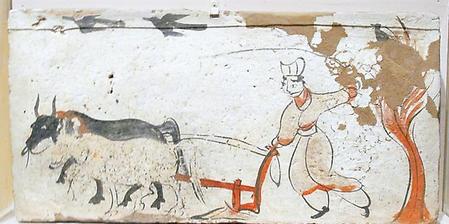 此后,在酒泉丁家閘十六國墓壁畫中就只有一牛牽引的雙轅犁了。說明魏晉時期是中國從二牛單轅犁過渡到一牛挽拉雙轅犁的時代,這一過渡的狀況及特點出現(xiàn)在嘉峪關(guān)地主墓葬壁畫中,又說明甘肅是這一重大農(nóng)技改革的地區(qū)之一。