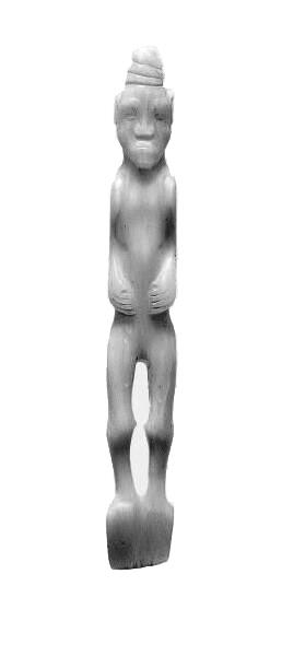 兩件玉人,一為白玉,玉人裸體直立,發(fā)辮虎首蛇身盤(pán)成堆髻。長(zhǎng)臉,闊鼻,深眼窩,大耳,厚唇前突,兩手捧腹,神情肅穆,玉人背部可見(jiàn)雙臂肘,以及脊柱凹槽。兩腿間“8”形鏤空,雙足并攏作鏟形,有斜刃。玉人無(wú)明顯性別特征,但從身軀面相可判定是男性。