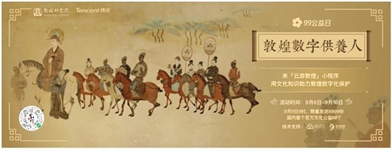 除了創(chuàng)意互動帶來的新奇體驗,敦煌研究院與騰訊在“99公益日”還將發(fā)布文博行業(yè)首個公益NFT(Non-Fungible Token,非同質(zhì)化通證)藏品。9月9日9時開始,用戶在“云游敦煌”小程序參與文化答題即有機(jī)會獲得這款限量數(shù)字藏品。這份NFT藏品生動呈現(xiàn)了《張議潮統(tǒng)軍出行圖》與《宋國河內(nèi)郡夫人宋氏出行圖》壁畫的細(xì)節(jié),并首次讓用戶在線上觀看到敦煌莫高窟第156窟的全景。