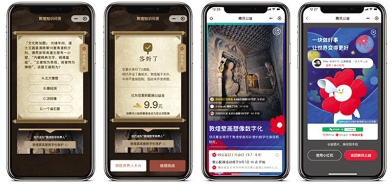 “云游敦煌”的“聲動畫語”讓壁畫“活”了起來,用戶可以通過觸點的方式進(jìn)入到不同的篇章中,通過動畫欣賞敦煌壁畫中晚唐時期的生活場景,并獲得與當(dāng)時社會民俗、服飾等相關(guān)的文化知識。觀看完動畫后,用戶還可以通過參與文化問答挑戰(zhàn),為中國敦煌石窟保護(hù)基金會募集善款。答對題目越多,募集到的善款也將隨之增多。款項將由騰訊公益慈善基金會直接出資,并全部用于敦煌莫高窟第427窟、145窟、138窟的數(shù)字化保護(hù)工程。通過這種方式讓每一位參與的用戶,都能夠用自己的知識為石窟數(shù)字化保護(hù)助力,成為新時代的敦煌“數(shù)字供養(yǎng)人”。
