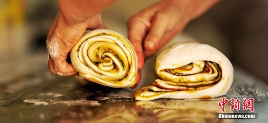 中秋節(jié)臨近,連日來(lái)蘭州市榆中縣家家戶戶開(kāi)始制作傳統(tǒng)月餅,依照古老的技藝在大花饅頭中加入香豆、油酥、姜黃、紅曲等各種佐料,層層卷曲,色彩斑斕,狀似玫瑰。張文 攝