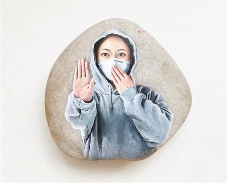 此前,馬玉蘭的黃河石畫是將傳統(tǒng)工筆與寫意、油畫與彩墨、彩繪藝術(shù)與現(xiàn)代審美元素相融合,按照石頭的天然紋理,用細膩的線條和多樣的色彩,描繪花鳥魚蟲的神態(tài)和意趣。疫情發(fā)生以來,她的作品轉(zhuǎn)向了人物寫實,不再“借物抒情”,而是“直抒胸臆”。