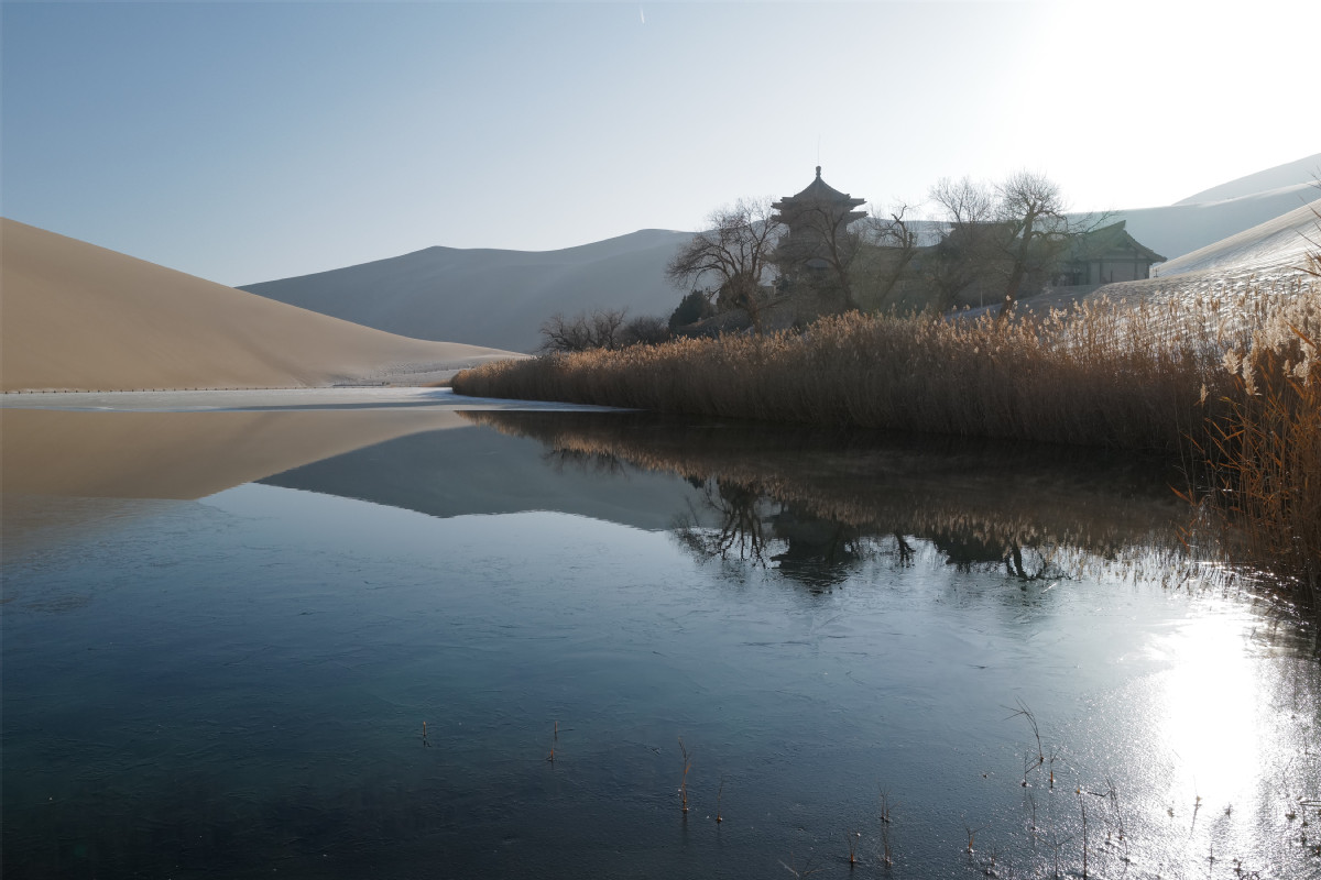圖為:12月11日,落雪后的月牙泉靜美如畫。