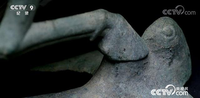 我整器由馬與飛鳥構成,一匹正在急速飛奔的駿馬,身高34.5厘米,身長45厘米,全身呈流線型,肌肉健碩有力。馬的三足騰躍在空中,一足踏上飛鳥。飛鳥不知后面追上來的是什么,驚回首的一剎那間,馬已經(jīng)超在了前面,這馬踏飛燕(馬超龍雀)夢幻般的瞬間被定格成為永恒。