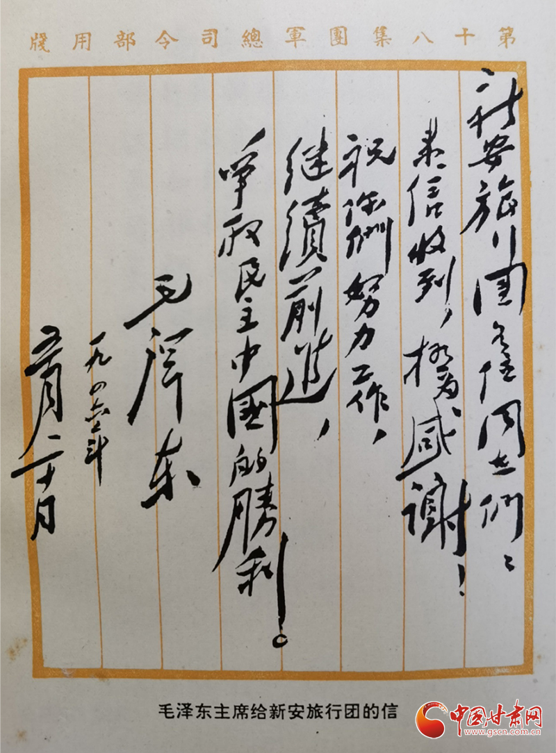 1946年5月20日,毛澤東主席給新旅回信:“新安旅行團(tuán)各位同志們:來信收到,極為感謝!祝你們努力工作,繼續(xù)前進(jìn),爭取民主中國的勝利。”時隔75年后的2021年5月30日,習(xí)近平總書記給新安小學(xué)的少先隊員們回信:“當(dāng)年,在黨的關(guān)懷和領(lǐng)導(dǎo)下,‘新安旅行團(tuán)’不怕艱苦,足跡遍及大半個中國,以文藝為武器,喚起民眾抗日救亡,宣傳黨的主張,展現(xiàn)了愛國奮進(jìn)的精神風(fēng)貌。希望你們結(jié)合自身成長實際學(xué)好黨史,以英雄模范人物為榜樣,從小堅定聽黨話、跟黨走的決心,刻苦學(xué)習(xí),樹立理想,砥礪品格,增長本領(lǐng),努力實現(xiàn)德智體美勞全面發(fā)展。”