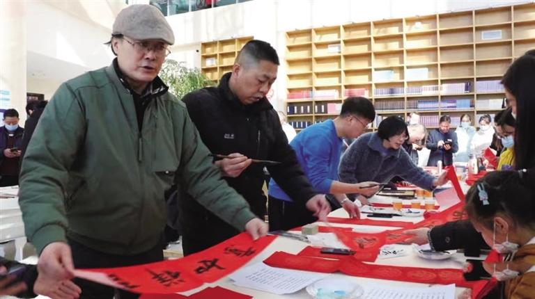活動中,蘭州畫院和市文化館的10余位書畫家提筆蘸墨、盡情揮毫,為新區(qū)圖書館精心創(chuàng)作了美術(shù)作品,并為聞訊趕來的眾多新區(qū)居民現(xiàn)場書寫了寓意吉祥的春聯(lián)和“福”字近400套(幅),在春節(jié)來臨之際為他們送上了美好的祝愿。