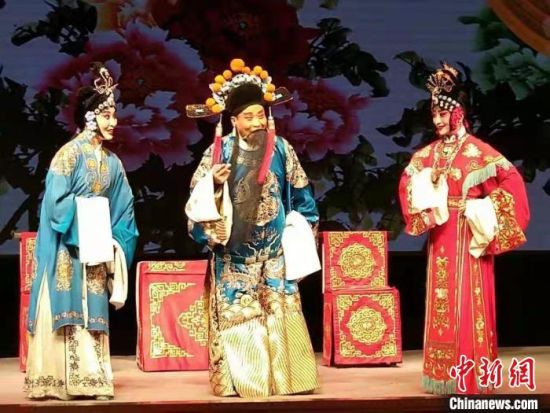 2月中旬,中新網(wǎng)記者采訪甘肅省級(jí)非遺傳承人趙希順。圖為趙希順(左二)登臺(tái)表演隴劇。 甘肅省隴劇院供圖