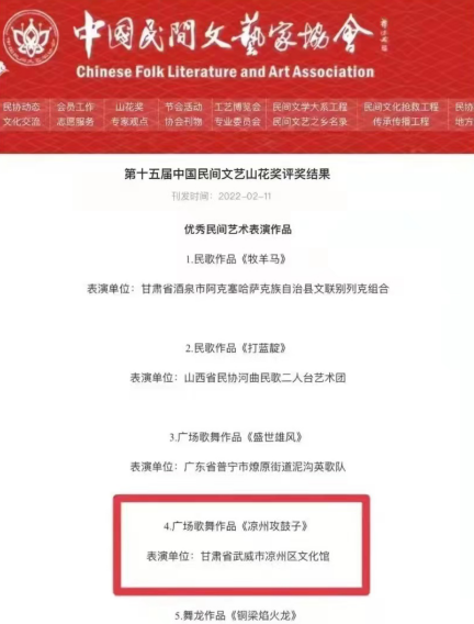 中國甘肅網(wǎng)3月14日訊(本網(wǎng)記者 張振國)近日,第十五屆中國民間文藝山花獎評獎結(jié)果公示,由武威市舞蹈家協(xié)會副主席付泓創(chuàng)作、武威市涼州區(qū)文化館表演的作品《涼州攻鼓子》榮膺該獎。該獎項的獲得,是武威市文藝創(chuàng)作和非遺保護傳承的又一優(yōu)秀成果。