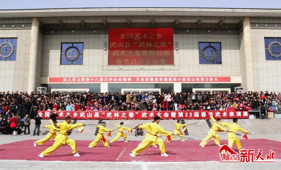 有武——武山是“全國武術(shù)之鄉(xiāng)”。全縣習武蔚然成風,有六合拳、八步轉(zhuǎn)等地方拳和國家套路、梅花槍、通備拳、硬氣功、太極拳等門類,常年習武人數(shù)達7萬多人,每年正月舉辦全縣武林之春武術(shù)表演大會。