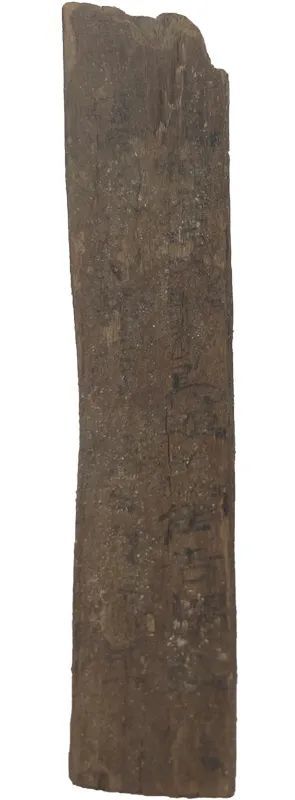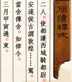 木簡(jiǎn)1枚(出土編號(hào):Ⅱ90DXT0213③:135),1990年出土于敦煌懸泉置遺址。長(zhǎng)7.2、寬1.3、厚0.25厘米。木簡(jiǎn)上殘,兩行書寫,字跡模糊,難以辨識(shí)。簡(jiǎn)文作“二人。使都護(hù)西域騎都尉、安遠(yuǎn)侯吉謂敦煌……駕,當(dāng)舍傳舍,如律令。三月甲寅過,東。”。簡(jiǎn)中“使都護(hù)西域騎都尉”是西域都護(hù)的正式官名,“騎都尉”當(dāng)指以本官都護(hù)西域,是其本職,而“使”則突出了使職性質(zhì)。這是懸泉置記錄的一份傳文書,簡(jiǎn)文不完整,大意是說某年三月甲寅日,西域都護(hù)鄭吉派遣的使者自西向東行,懸泉置依傳律規(guī)定,為停駐的兩名使者提供了飲食。該簡(jiǎn)文對(duì)研究懸泉置的傳舍制度,以及西漢王朝對(duì)西域行使管轄提供了重要的原始資料?,F(xiàn)藏甘肅簡(jiǎn)牘博物館。