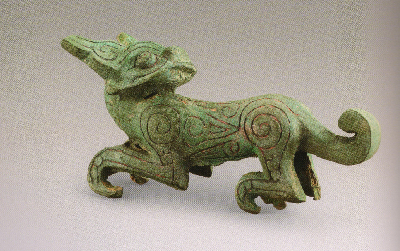 禮縣大堡子山祭祀樂器坑出土,共三只,造型相同,大小相似,為全國虎伴樂器出土的首例。其形象回首卷尾、聳耳曲爪、憨態(tài)可掬,極具觀賞性,是春秋時期虎造型的杰作,體現(xiàn)了秦國早期高超的造型能力和精湛的鑄造技術?;⒌男蜗笤诖呵锴厝说钠魑镏卸嘁?,不但有自成個體的金虎、青銅回首虎,同時虎作為附飾也出現(xiàn)在一些大的青銅器上。