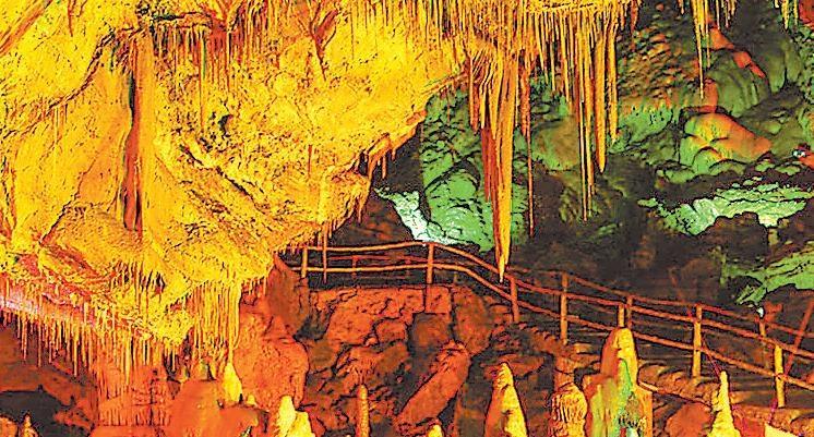 洞口低矮狹窄,感覺洞內昏暗潮濕,深不可測。順著崎嶇不平的臺階,高一腳低一腳摸索著往前走了十幾步,忽然,眼前色彩繽紛,美輪美奐,這是何等美妙的仙境,各類石筍、鐘乳石、石柱像是午夜的森林,一下子占據了所有的視野。