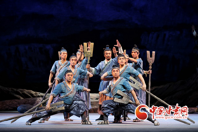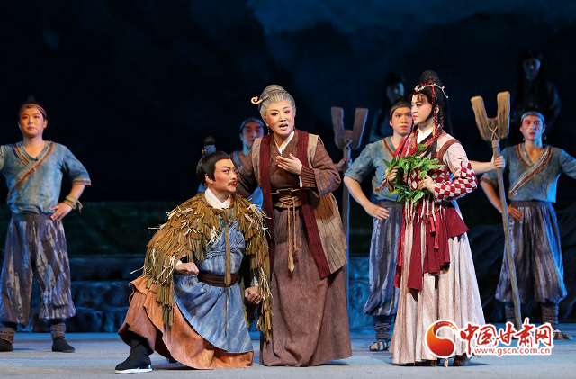 隴劇《大禹治水》是在甘肅省文化和旅游廳全程指導(dǎo)下,《黃河流域生態(tài)保護(hù)和高質(zhì)量發(fā)展規(guī)劃綱要》出臺(tái)之際,甘肅文藝工作者挖掘黃河文化蘊(yùn)含的時(shí)代價(jià)值,講好“黃河故事”,實(shí)施隴原文藝高峰攀登工程、加強(qiáng)非物質(zhì)文化遺產(chǎn)保護(hù)傳承的具體行動(dòng)。該劇將“大禹”這個(gè)上古英雄請下神壇,為他賦予了親情、愛情、家國情懷,在兩個(gè)小時(shí)的演出中,領(lǐng)銜出演“大禹”的優(yōu)秀青年演員邵炳德與雷通霞、竇鳳霞、佟紅梅等“三朵梅花”同臺(tái)飆戲,火花四濺的“開山”、扣人心弦“治水”,將大禹和先民們不畏艱險(xiǎn)、篳路藍(lán)縷的開拓精神和奮斗精神,演繹得淋漓盡致,深深震撼著現(xiàn)場觀眾。而隴劇音樂獨(dú)有的“麻簧”、以皮影戲?yàn)楸憩F(xiàn)手法的“月下婚禮”場景、水袖舞場景,把人物的情緒表現(xiàn)得栩栩如生,將獨(dú)具特色的隴劇藝術(shù)盡情綻放在舞臺(tái)之上。