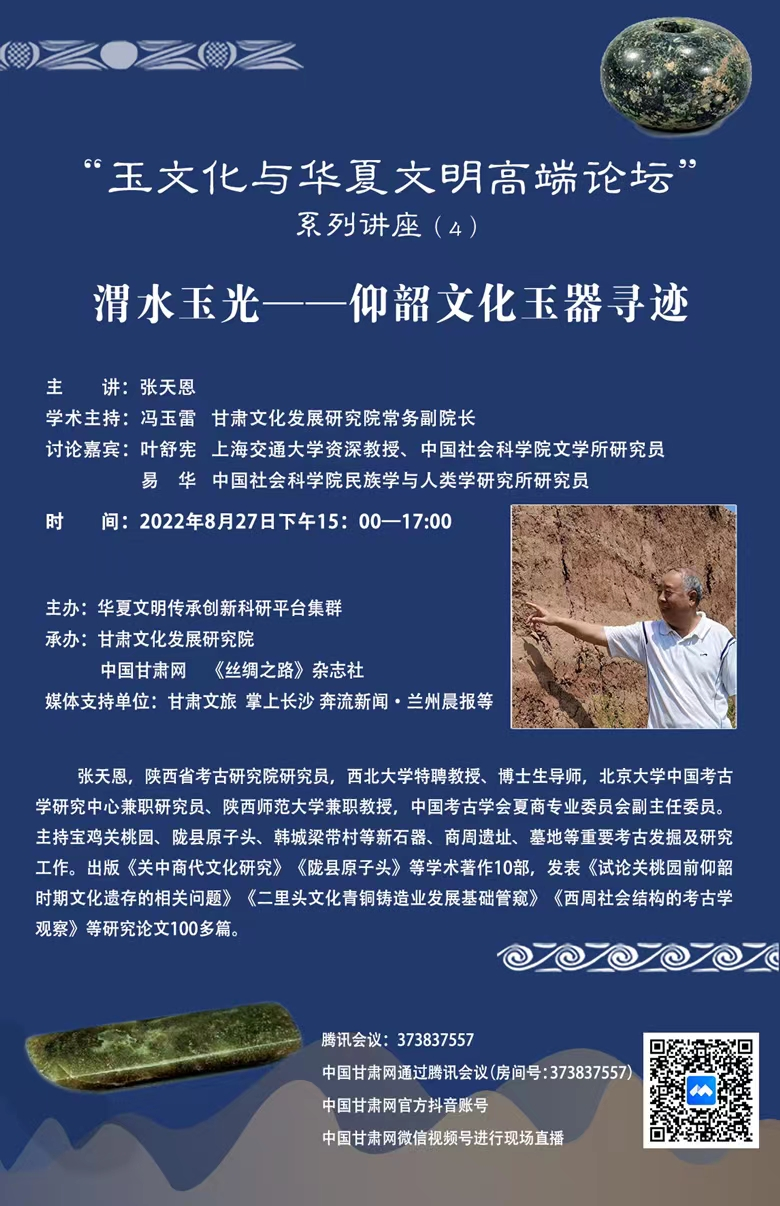 中國甘肅網(wǎng)8月28日訊  27日下午15:00—17:00,由西北師范大學華夏文明傳承創(chuàng)新科研平臺集群主辦,甘肅文化發(fā)展研究院、中國甘肅網(wǎng)、《絲綢之路》雜志社聯(lián)合承辦的“玉文化與華夏文明高端論壇”第四講《渭水玉光——仰韶文化玉器尋跡》成功舉辦。