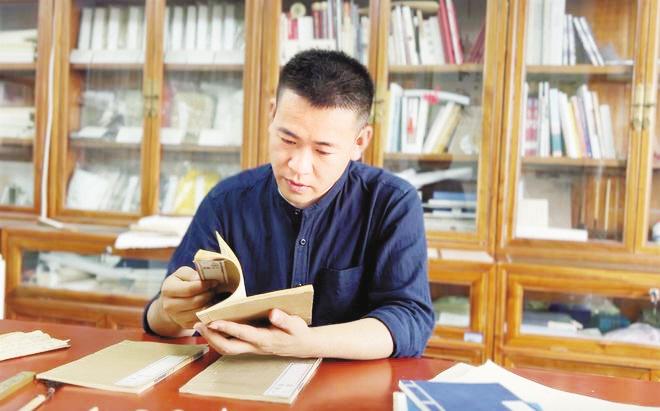 他一邊輕輕撥弄著桌案上泛黃的紙頁(yè),一邊用毛筆蘸上漿糊,粘補(bǔ)書(shū)頁(yè)上的缺損部分。