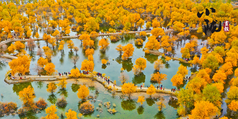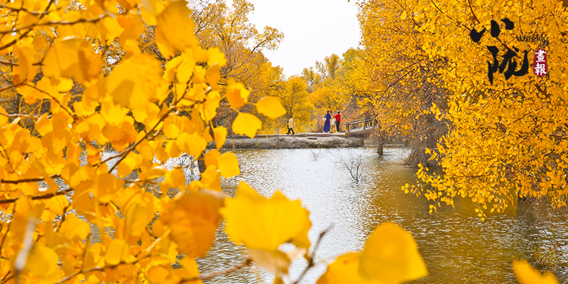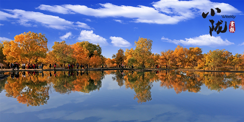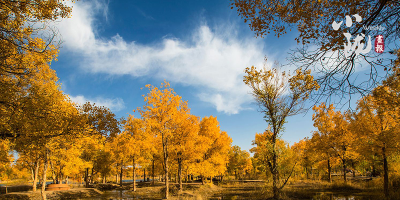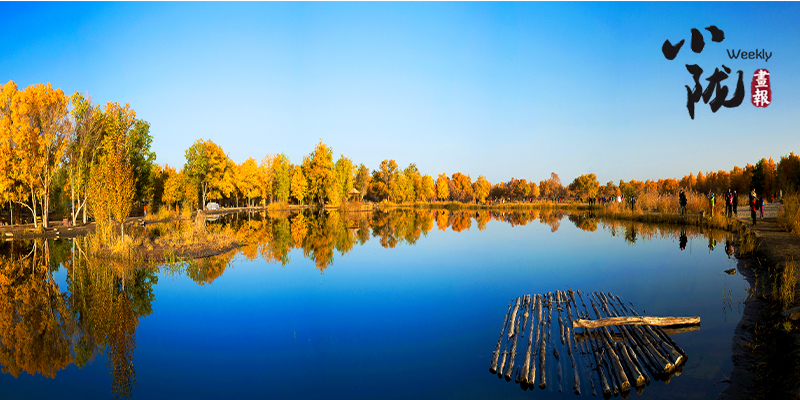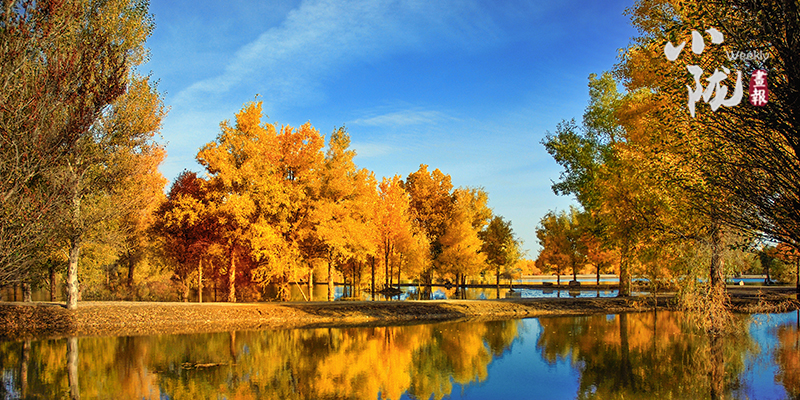 秋風起時,一樹金黃在湛藍的天空下連綿不絕,映著湖面,和流云飄逸的藍天一起,綻放成一幅壯麗的圖景。