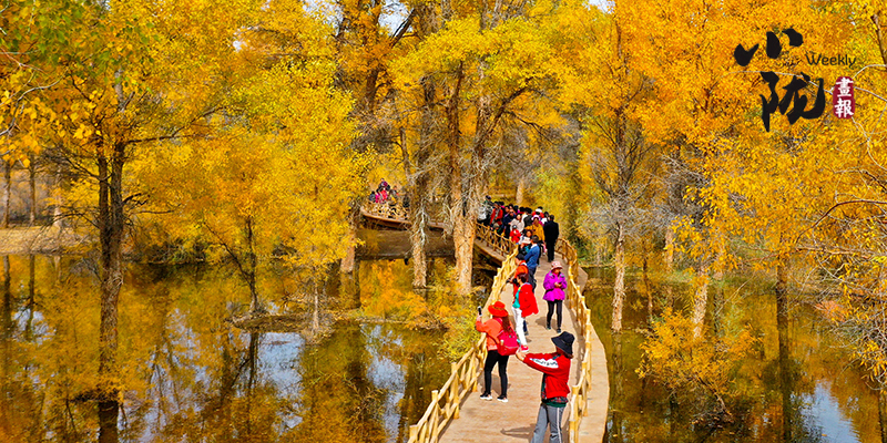 漫步林中,就仿佛進入神話中的仙境。茂密的胡楊干奇百怪,神態(tài)萬般。粗壯、滄桑的胡楊幾個人難以合抱,挺拔的有七八丈之高,怪異的似蒼龍騰越、虬蟠狂舞。每一棵高大的樹冠枝頭,間或又有淺綠、淡黃的葉片在閃現(xiàn),錯落有致,色彩繽紛,滿眼的赤橙黃綠與盈盈秋水互相映襯,令人嘆為觀止?!?/p>