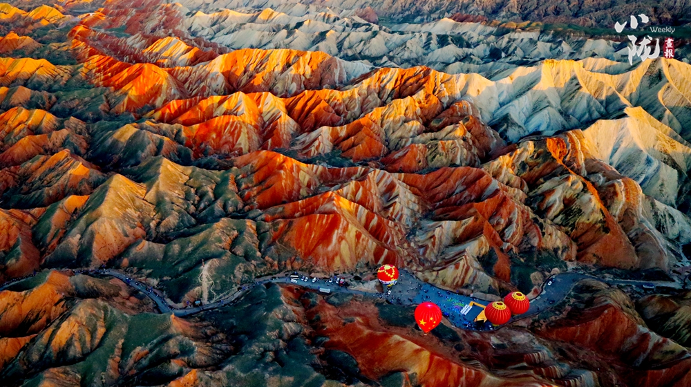 丹霞四季皆勝景,丹霞紅白相間的線條滑過橢圓形丘陵,宛如少女七彩裙擺處的流蘇,隨風搖曳,風情萬種。遠方低矮的彩色丘陵層層疊起,千姿百態(tài),雄渾壯麗,如隱藏在山谷中的萬千疑兵,引人無限遐想。