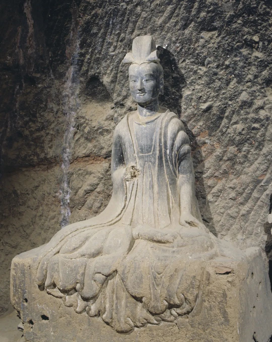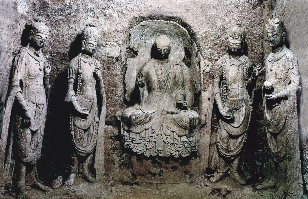 它一改西魏造像繁縟華麗、服飾厚重的特點(diǎn),無(wú)論是佛、菩薩、弟子,還是飛天和力士,服飾輕柔而貼體,均展現(xiàn)出一種雄健挺拔、恬靜自然的氣韻,面相方圓,五官清秀而緊湊。佛低平肉髻,身穿圓領(lǐng)通肩或垂領(lǐng)式袈裟,衣裾下擺緊貼佛座,陰刻圓潤(rùn)流暢的褶皺紋。菩薩也由束發(fā)高髻改為頭戴花冠,周身飾瓔珞,體姿婀娜而不失端莊。