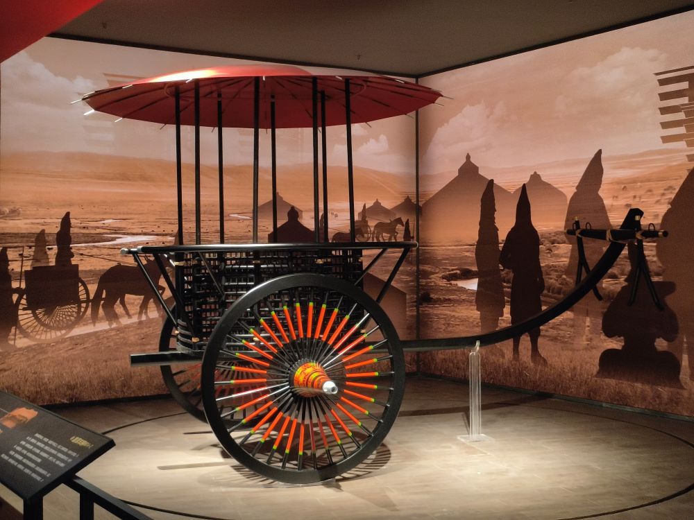 這是在甘肅省天水市張家川縣馬家塬車輿博物館拍攝的復(fù)原戰(zhàn)國車輿(8月10日攝)。新華社記者 王紫軒 攝