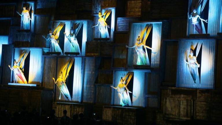 活化敦煌古樂器、古樂譜研發(fā)成果的《樂動(dòng)敦煌》,采用全息投影、3D威亞等高科技手段,以全沉浸式的呈現(xiàn)方式,演繹了西域少年白氏追尋藝術(shù)的動(dòng)人故事,劇中運(yùn)用了來自敦煌壁畫中復(fù)原的五弦琵琶、排簫、蓮花阮等16件古樂器,演繹了胡旋舞、腰鼓舞、琵琶舞等多種敦煌舞蹈,還原了敦煌壁畫中的樂舞盛景。