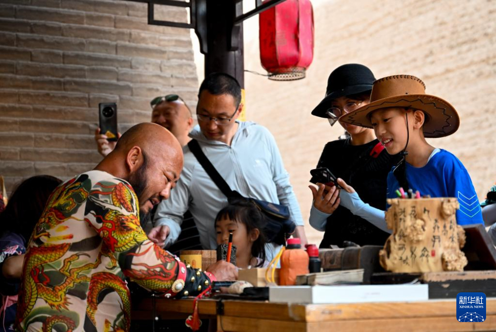 7月14日,在甘肅嘉峪關(guān)關(guān)城景區(qū),游客在李森的攤位前等待他“簽發(fā)關(guān)照”。新華社記者 陳鐘昊 攝