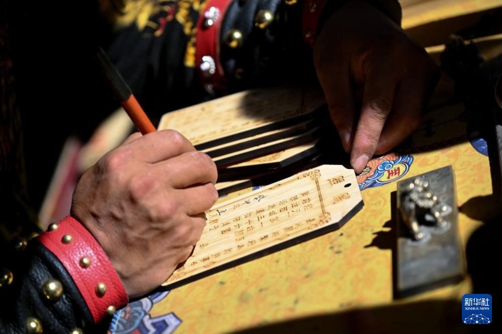 7月13日,在甘肅嘉峪關(guān)關(guān)城景區(qū),李森為游客手寫(xiě)文創(chuàng)產(chǎn)品“關(guān)照”。新華社記者 劉金海 攝
