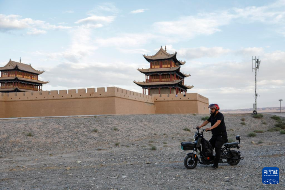 7月13日,李森結(jié)束一天的工作離開(kāi)甘肅嘉峪關(guān)關(guān)城景區(qū)騎電動(dòng)車(chē)回家。新華社記者 方欣 攝