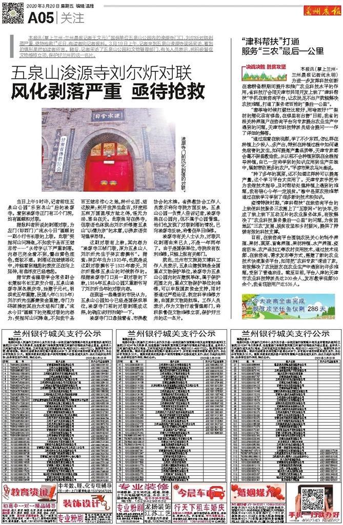 2020年3月20日《蘭州晨報(bào)》刊登呼吁搶救五泉山劉爾炘對(duì)聯(lián)的報(bào)道。