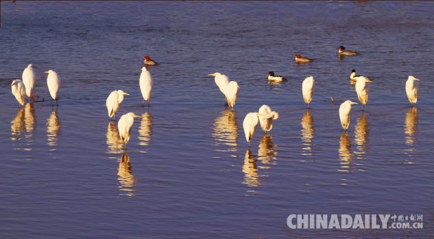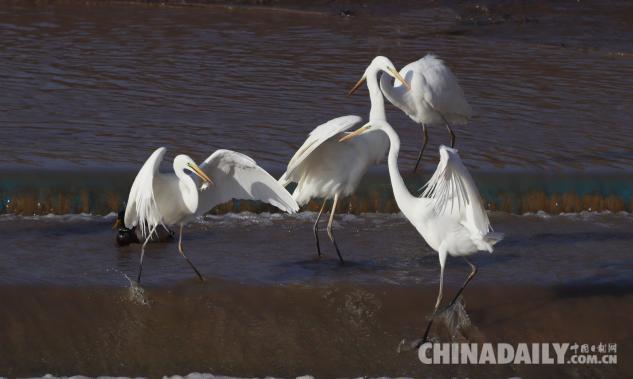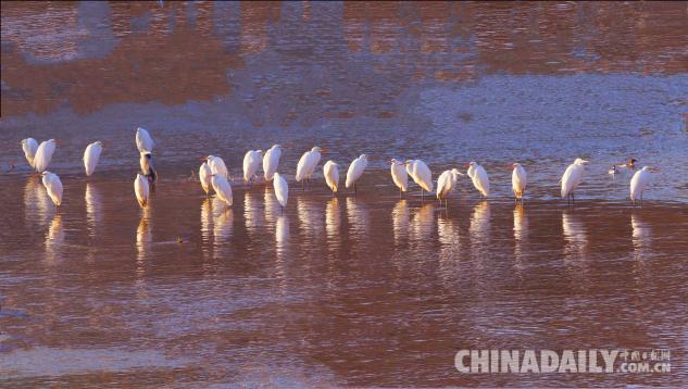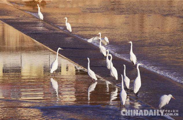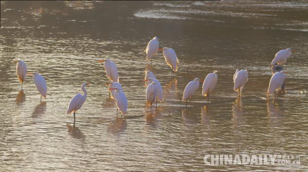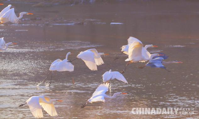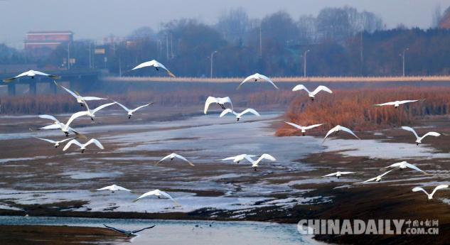 1月15日,數(shù)十只潔白的白鷺飛臨甘肅崇信城段的汭河,它們在此集結(jié)安家。