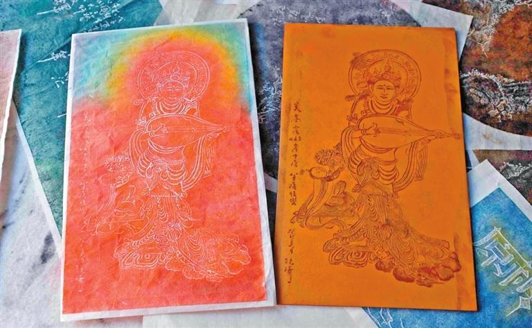 走進工作室,墻壁四周掛滿了雅致的傳拓字畫,阮琦也向記者講述了拓印畫——“拓印敦煌”系列的始末。