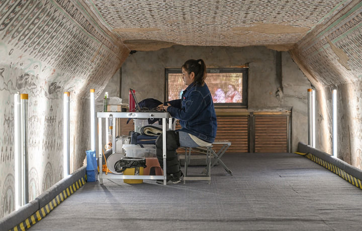 2023年8月3日,在敦煌莫高窟正在保護(hù)修繕的第55窟內(nèi),一位文保工作者對采集的數(shù)據(jù)進(jìn)行整理。新華每日電訊記者 李賀 攝