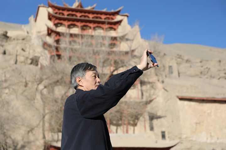 2022年2月23日,敦煌研究院院長蘇伯民正在用手機(jī)進(jìn)行“數(shù)字敦煌”體驗(yàn)。 新華每日電訊記者 張睿 攝