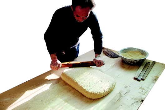七十二行,釀酒、熬糖最繁瑣。香甜的麥芽糖,如同世間的其他事物一樣,都是通過(guò)勞苦換來(lái)的,正所謂苦盡甘來(lái)。田新民做灶糖用的是麥芽糖,首先要將原料小麥浸泡生芽,然后生成麥芽,不過(guò)有了麥芽,還要經(jīng)過(guò)多道工序才能變成麥芽糖。通常泡發(fā)麥芽之后,接下來(lái)就是蒸制配料,要依次進(jìn)行碾米、浸泡籠蒸、擠糖汁、二次籠蒸,再用力將麥芽搗碎,拌入蒸熟的黃米裝缸,加開水浸泡,淋出第一遍糖汁,再加開水淋出第二遍糖汁。然后再把兩次淋出的糖汁,倒至鐵鍋內(nèi)加小火,用木锨或木棒攪動(dòng),使水分蒸發(fā)凝結(jié)成固體,最終即得麥芽糖。熬糖要反復(fù)三次,經(jīng)過(guò)六個(gè)小時(shí)才能成功。田新民說(shuō):“這樣熬出來(lái)的糖,密封好后,埋在地下很多年都不會(huì)壞。”