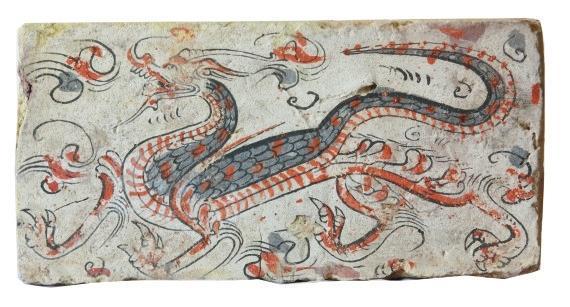 磚面上龍的形象棱角分明,骨架清瘦。龍身前屈后伸,起伏轉折,龍首高昂,張口吟嘯。前肢呈登騰狀,后肢做行進狀。鬣鬃飛揚,揚爪攪尾,四爪如鷙,整條龍動態(tài)十足,形象逼真,為五代時期模印花磚中的精品。