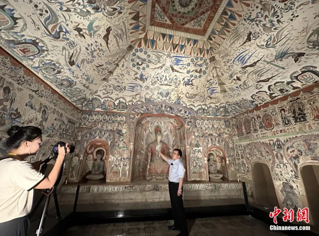 2023年7月,敦煌研究院副院長(zhǎng)張?jiān)衷诙鼗湍呖叩?85窟原大復(fù)制窟內(nèi),接受中新社“東西問(wèn)”獨(dú)家專訪。丁思 攝