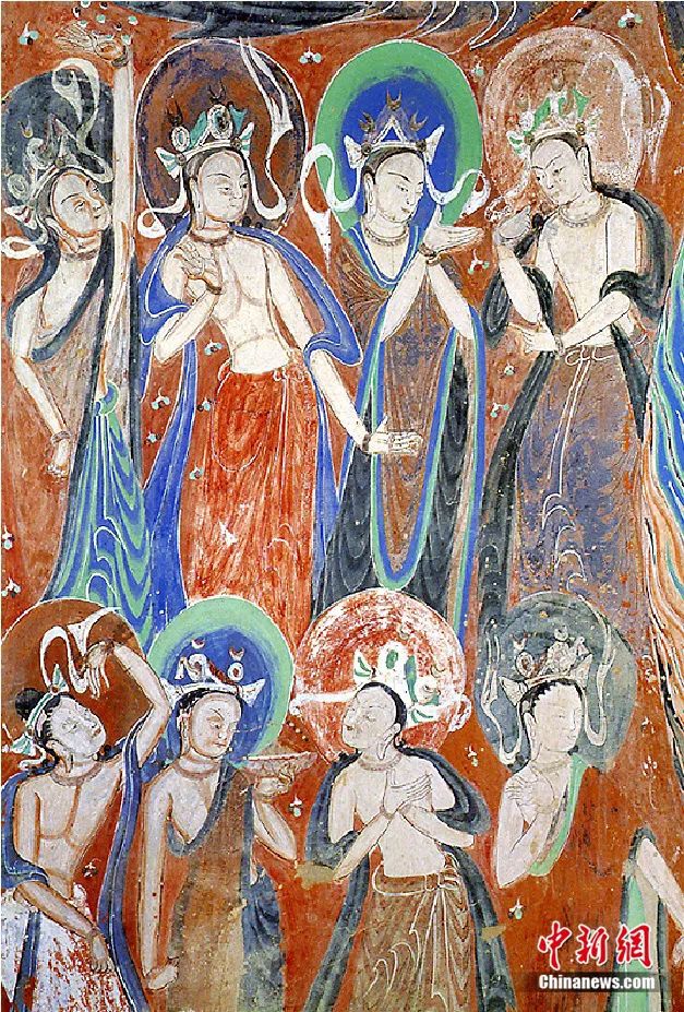 張?jiān)郑憾鼗捅诋?huà)中,有中國(guó)傳統(tǒng)神話中的神靈形象,如東王公、西王母、菩薩、觀音、伏羲、女?huà)z、雷公,以及青龍、白虎、朱雀、玄武等祥瑞動(dòng)物和異獸形象;也有來(lái)自印度—西域典型的神靈形象,有阿修羅、迦樓羅(金翅鳥(niǎo)王)、緊那羅(樂(lè)天)、大蟒神等等。除印度佛教及其藝術(shù)影響外,具有波斯—中亞藝術(shù)典型特色的連珠紋、對(duì)鳥(niǎo)對(duì)獸紋在敦煌壁畫(huà)中也非常流行;壁畫(huà)人物頭飾“三面寶冠”上裝飾的月形、日月形飾物題材,來(lái)源于薩珊波斯。又如北朝時(shí)期敦煌壁畫(huà)中的人物造型風(fēng)格,既有西域式的“龜茲風(fēng)”,又有來(lái)自中原、南朝的“褒衣博帶”“秀骨清像”式。