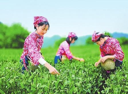 走進(jìn)茶園里,看到數(shù)名茶農(nóng)身挎小竹籮,慢慢穿行在茶樹(shù)之間,只見(jiàn)她們動(dòng)作快速而嫻熟,一捻一放,徐徐前行在滿(mǎn)眼的綠意里。