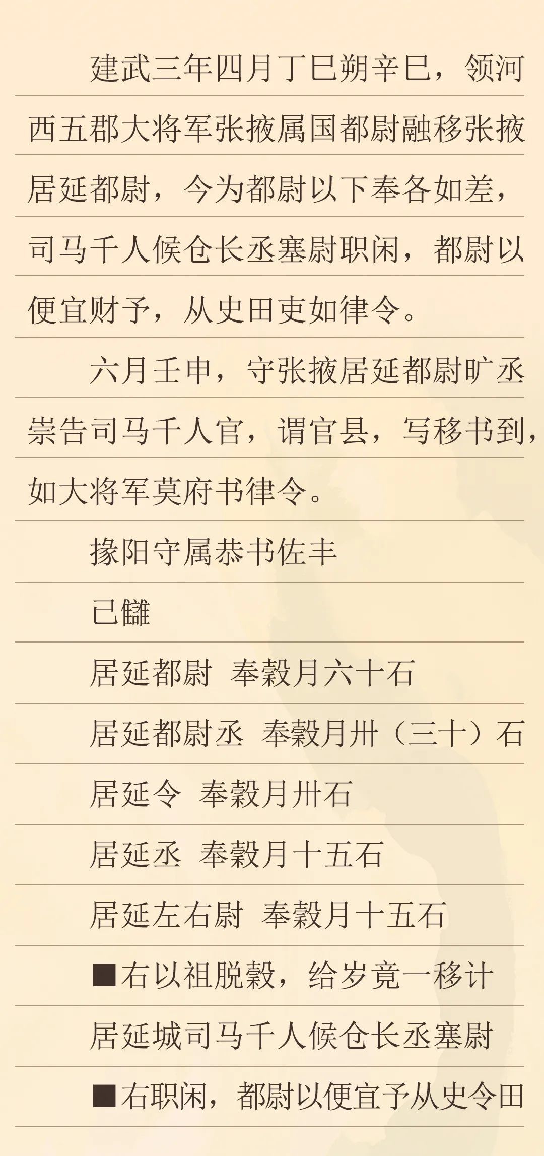 這封冊書記載了建武三年,竇融管轄河西時(shí)發(fā)布的一條關(guān)于都尉以下官吏奉谷等差的命令。根據(jù)竇融發(fā)布的新規(guī)定,我們可以看到,秩比二千石的居延都尉月奉谷僅為六十石,史書有“十斗一斛”及“十斗一石”的記載,此六十石即是六十斛,相比于史書記載中比二千石每月百斛的俸例要少,而其余官吏的俸祿也相應(yīng)要少,雖然漢代不同時(shí)期的官吏俸祿存在變化,但對(duì)比所見的這種情況,可能也跟兩漢之交戰(zhàn)亂頻仍的社會(huì)環(huán)境有重要關(guān)系。