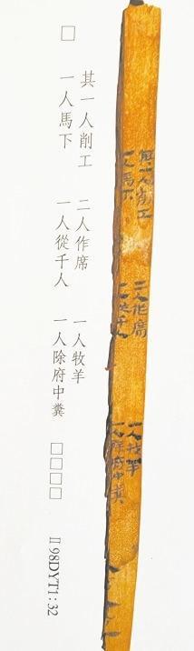 簡7是都尉府戍卒日作簿,戍卒分工簡明清楚。“削工”用紅柳、胡楊木削制簡牘。作席,疏勒河沿岸生長著大量芨芨草、蘆葦,戍卒用來編制席笆,用于防潮御寒。疏勒河沿岸水草豐茂,適宜放牧。“一人牧羊”可知,養(yǎng)牛、羊供都尉府吏員食用。“一人馬下”,由于缺當時的語言環(huán)境,釋義模糊。千人是都尉府中級軍官職務(wù)。除府中糞,清除廁所糞便。