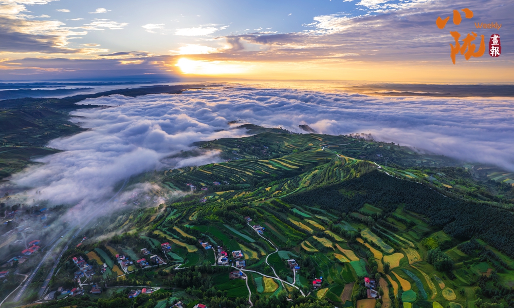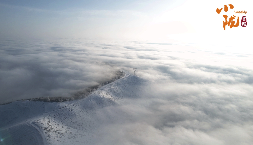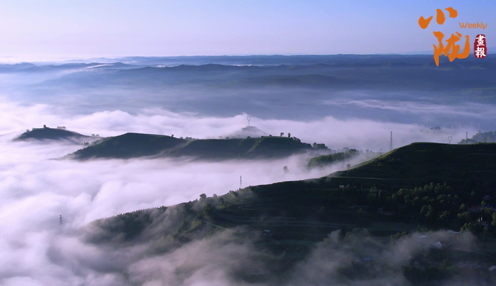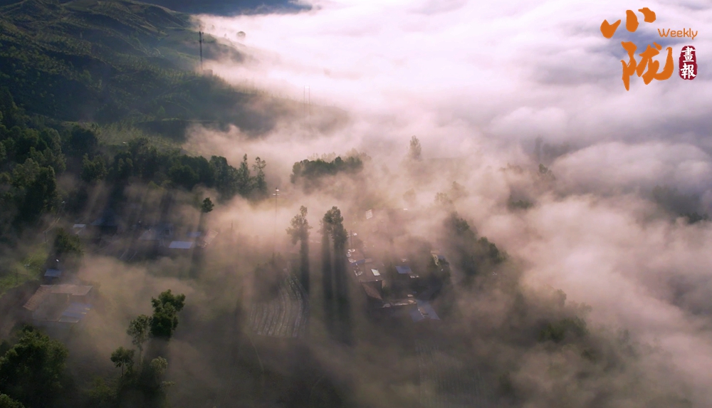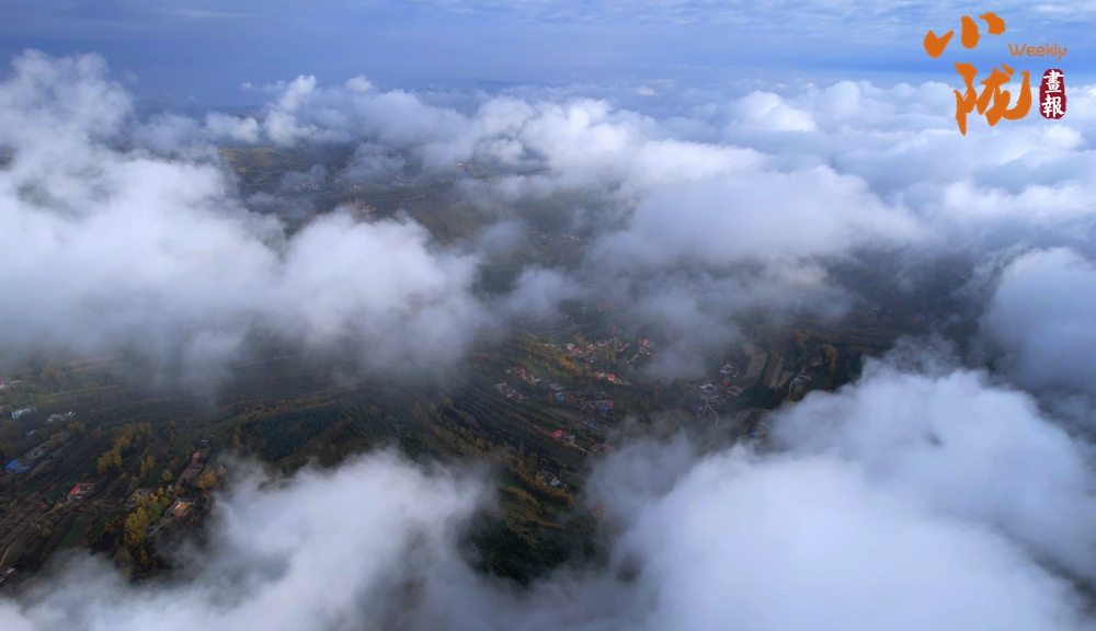 從高處俯瞰,白色的云海在大地上空翻騰涌動,時而聚攏,時而消散,田園、村莊在云霧中時隱時現(xiàn),如夢如幻。