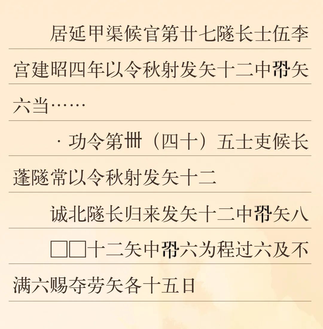 漢代對于官吏的考核分為文職和武職。文職主要考核書寫能力、治理能力、財務(wù)能力、法律能力等;武職考核主要是一年一度的射箭考核,因為在秋季舉行,故稱為“秋射”,發(fā)十二箭,中六箭為合格(即“中程”)。河西邊塞的官府通過秋射這一活動,借以考察和檢驗邊塞吏員們的軍事技術(shù)水平,并以此作為賜勞和奪勞的依據(jù)。為了提高吏員們的射箭技術(shù),邊塞官府還派專人來管理訓練吏卒。邊塞參加秋射的主要是烽燧的燧長、部塞的候長、候官的候等吏員。