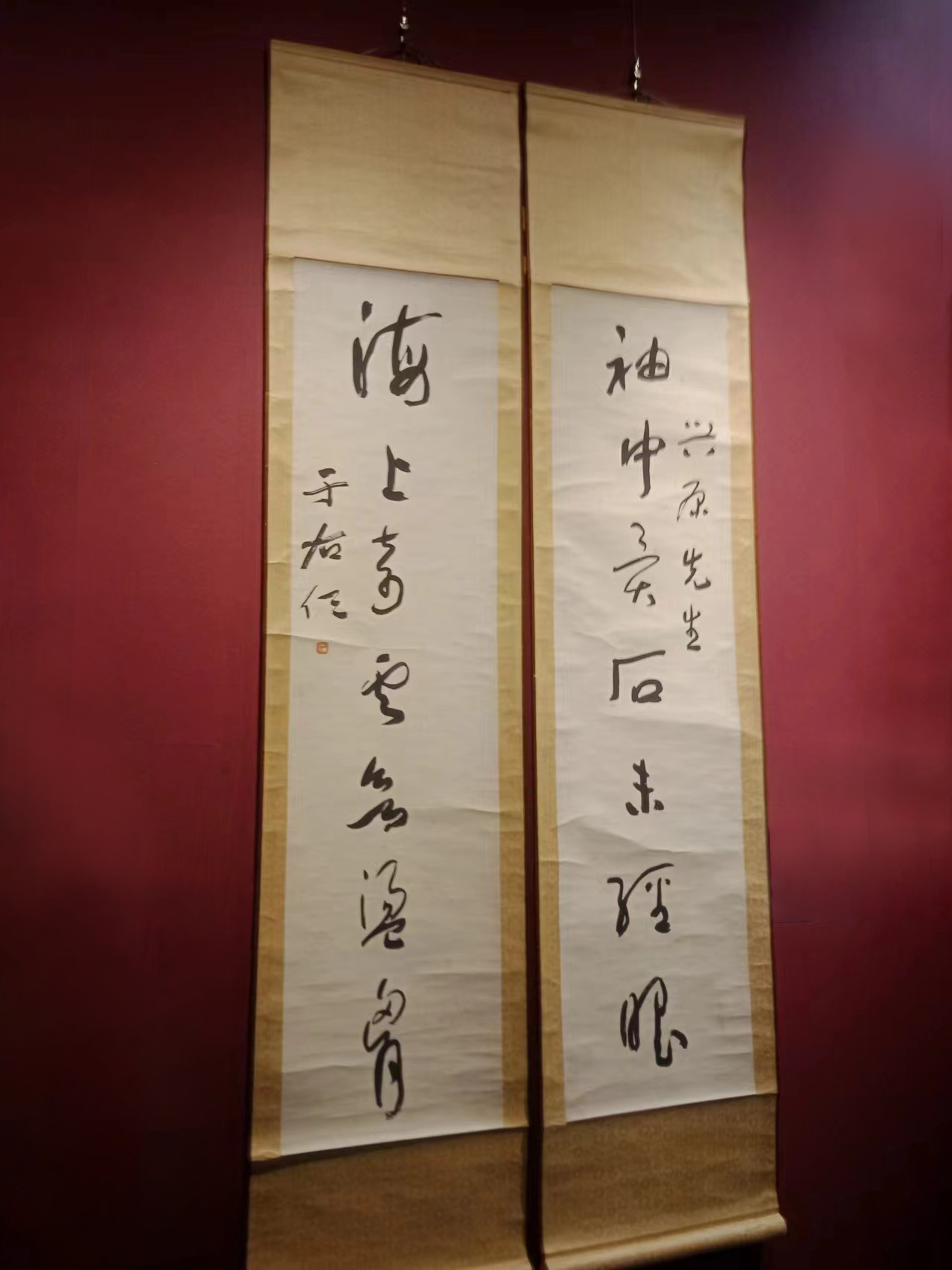 這次展出的于右任先生書法十余幅,有草書、行書和楷書。草書古詩(shī)“蜀本九經(jīng)最先出,后來(lái)孳乳到長(zhǎng)興。蒲津毋氏家錢造,海內(nèi)通行價(jià)倍增(此幅落款‘五十一年’,應(yīng)是1962年先生去世前的作品)”,行書七言聯(lián)“袖中異石未經(jīng)眼,海上奇云未蕩胸”,楷書七言聯(lián)“萬(wàn)卷藏書宜子弟,十年種木長(zhǎng)風(fēng)煙”等,書藝嫻熟,各有特色。所展墨寶筆法老練,墨氣逼人,筆者懷著崇敬的心情駐足敬賞,猶如與先生會(huì)面,久久不忍離去。