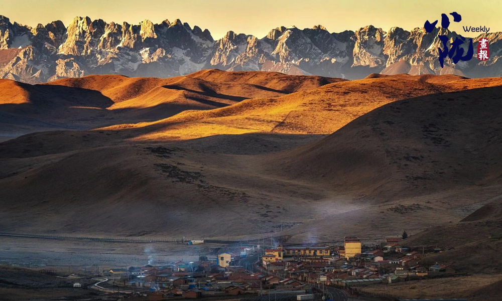 遠處連綿的群山白雪皚皚,山下青黃的草甸、安靜的藏式小村、飄蕩的經幡、裊裊炊煙,勾勒出一幅美麗的畫。