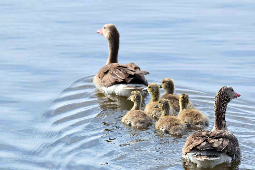 灰雁是鴨科雁屬鳥類,屬國家重點保護(hù)的“三有”鳥類,也是陽關(guān)濕地的夏候鳥。監(jiān)測顯示,在陽關(guān)濕地繁殖的灰雁家族有100多只。每年3月下旬遷飛至陽關(guān)濕地,4月中旬筑巢繁殖,5月上旬孵化出雛鳥4至5只。灰雁為“一夫一妻”制,孵化由雌鳥單獨承擔(dān),雄鳥在巢附近負(fù)責(zé)警戒。待雛鳥破殼出窩后,則由雌雄共同撫育。灰雁生性膽小、機(jī)警,小寶寶溜達(dá)時,雌鳥在前開道,雄鳥負(fù)責(zé)斷后,小寶寶上岸覓食嫩草芽時,雄鳥仍然負(fù)責(zé)警戒,若有危險立刻鳴叫警示。故而,近距離拍攝灰雁雛鳥是比較困難的。